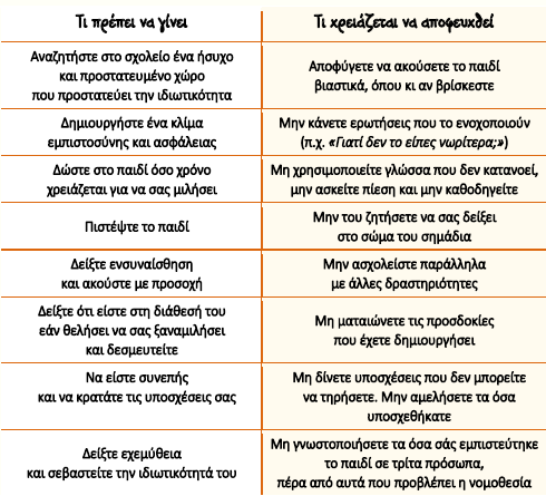 – «Μπορείς να μου μιλήσεις ξανά όποτε το θελήσεις. Θα κάνω ό,τι μπορώ για να σε βοηθήσω» – «Δεν πρόκειται να πω το μυστικό σου στους φίλους σου ή στους συμμαθητές σου. Όμως, για να σταματήσει αυτό που γίνεται, θα πρέπει να ενημερώσω τον/την Διευθυντή/ντρια του σχολείου ή να μιλήσω σε κάποιον που η δουλειά του είναι να προστατεύει τα παιδιά»