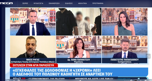 Στην πρωινή εκπομπή του MEGA «κοινωνία ώρα MEGA» στις 23/07/25 για το σχολιασμό των ανωτέρω συμβάντων βρέθηκαν καλεσμένοι ο Αντιπρόεδρος της Ένωσης Αστυνομικών Υπαλλήλων Αθηνών, κος Πήγας Νίκος, η Ψυχολόγος Δρ. Παπακίτσου Βάνα και ο Εγκληματολόγος κος Παπαϊωάννου Παναγιώτης.